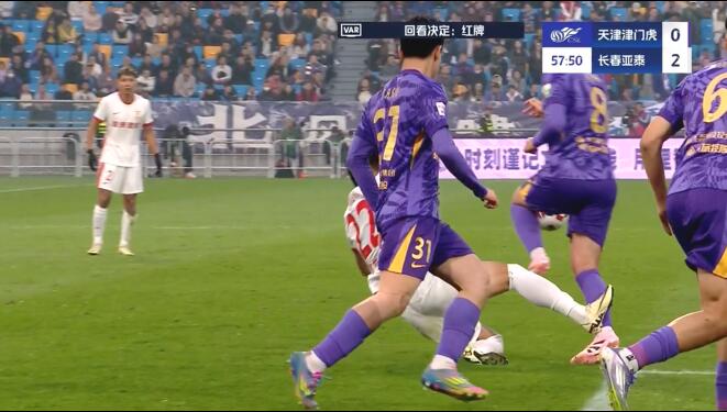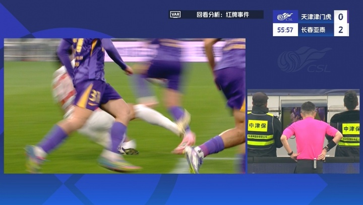 足球日报10月25日播报讯 津门虎vs亚泰第58分钟,王禹放铲蹬踏哈达斯小腿,主裁先是给了黄牌,随后长时间观看VAR回放后改判红牌,将其直红罚下!
