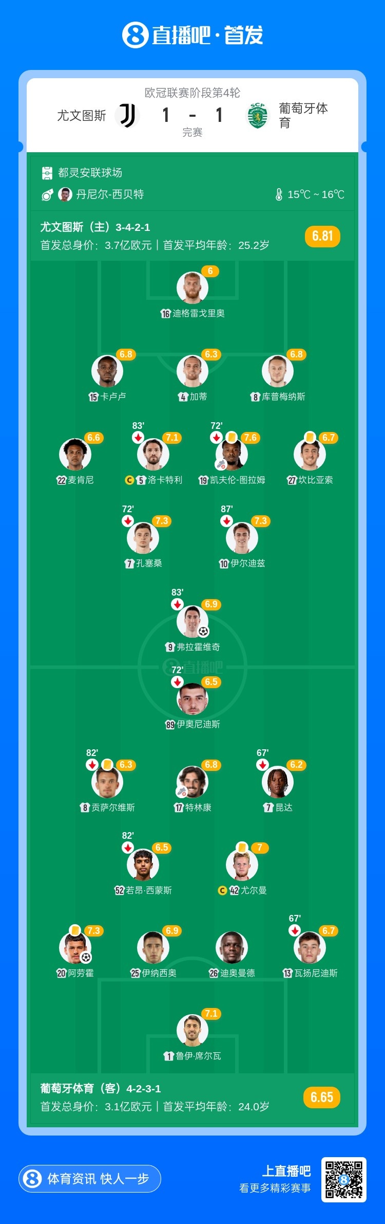 足球日报11月5日播报讯 欧冠联赛阶段第4轮,尤文图斯坐镇主场都灵安联球场迎战葡萄牙体育。上半场,M-阿劳霍先拔头筹,特林康中框,弗拉霍维奇破门。易边再战,瓦扬尼迪斯失良机。最终尤文1-1葡萄牙体育。积分榜方面,尤文四轮仅3分,葡体7分。